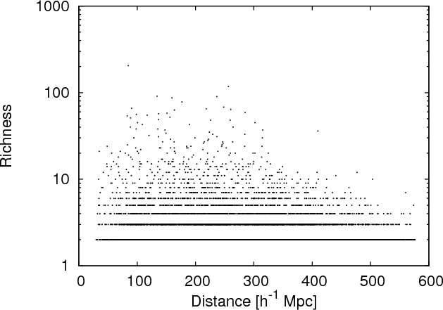Einasto et al. (1984) and Berlind et al. (2006) have concluded that it is not easy to find a suitable linking length even for a volume-limited sample of galaxies. The virialisation condition, a certain density contrast level, FoF methods, or other criteria do not work universally well for all density ranges of the galaxy distribution, due to the variable mean density of galaxies in different regions of space. Additional difficulties arise for flux-limited samples of galaxies where the linking length depends also on the distance from the observer. Eke et al. (2004) have given a summary of various methods to find clusters in galaxy samples.