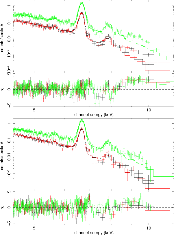 Upper panel: pn (green) and MOS (black and red) spectra of region Y (black ellipse in Fig. 2) together with their best-fit model and residuals. Lower panel: