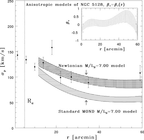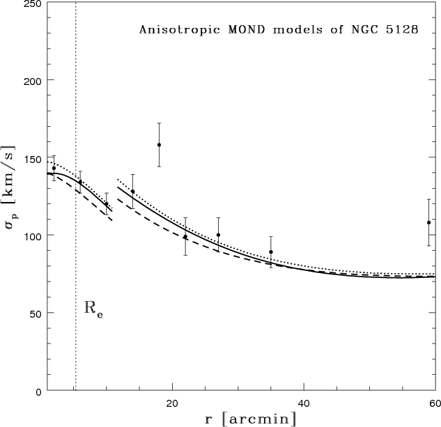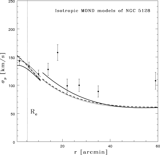 MOND theory (Milgrom 1983). As was to be expected, the MOND models described NGC 3379 on all scales(Tiret et al. 2007). On the other hand, the MOND models failed to reproduce the kinematics of NGC 1399, and Richtler et al. (2008)