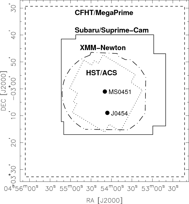- This work is based on data collected at the Subaru Telescope, which is operated by the National Astronomical Observatory of Japan; based on observations obtained with MegaPrime/MegaCam, a joint project of CFHT and CEA/DAPNIA, at the Canada-France-Hawaii Telescope (CFHT) which is operated by the National Research Council (NRC) of Canada, the Institut National des Sciences de l'Univers of the Centre National de la Recherche Scientifique (CNRS) of France, and the University of Hawaii; based on observations made with ESO Telescopes at the La Silla and Paranal Observatories, Chile (ESO DDT Programme 282.A-5066); based on observations made with the NASA/ESA Hubble Space Telescope (programme #9836) obtained at the Space Telescope Science Institute, which is operated by the Association of Universities for Research in Astronomy, Inc., under NASA contract NAS 5-26555; based on observations obtained with XMM-Newton, an ESA science mission with instruments and contributions directly funded by ESA Member States and NASA; based on data obtained at the W.M. Keck Observatory, which is operated as a scientific partnership among the California Institute of Technology, the University of California and the National Aeronautics and Space Administration. The Observatory was made possible by the generous financial support of the W.M. Keck Foundation.