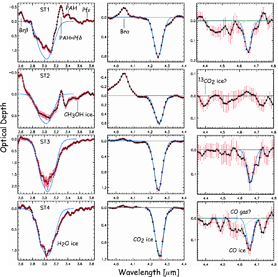 AKARI. We estimated the column densities of the H2O, CO2, and CO ices based on their 3.05, 4.27, and 4.67