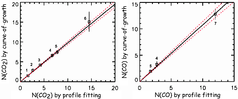 Figure A.2: Comparison of the CO2 and CO ice column densities derived from the low-resolution spectra by the curve-of-growth and those derived from the high-resolution ISO-SWS spectra by the laboratory ice fitting (Gerakines et al. 1995; Gibb et al. 2004). The axes are expressed in units of 1017 cm-2. Solid and dashed lines indicate the result of the linear fit and its one sigma error. The labeled numbers in the figure correspond to the name of the objects that are used in this analysis as follows; 1. Mon R2 IRS3, 2. Orion IRC2, 3. S140, 4. Elias 29, 5. AFGL 2136, 6. W33A, 7. NGC 7538 IRS9. |