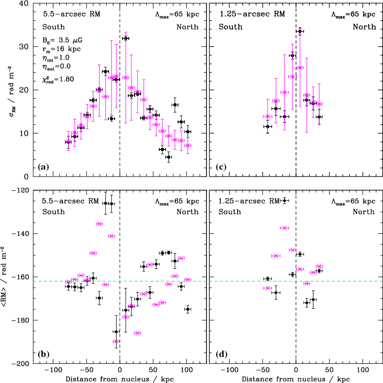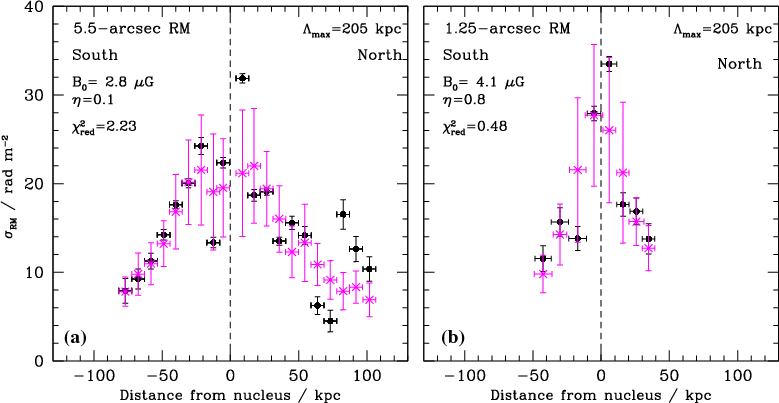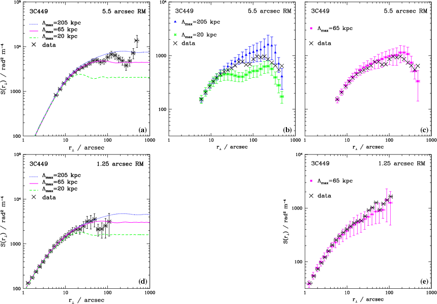 Several studies of Abell clusters (Murgia et al. 2004; Govoni et al. 2006; Guidetti et al. 2008) have shown that detailed RM images of radio galaxies can be used to infer not only the strength of the cluster magnetic field, but also its power spectrum. The analysis of Vogt & Enßlin (2003, 2005) suggests that the power spectrum has a power law form with the slope appropriate for Kolmogorov turbulence and that the auto-correlation length of the magnetic field fluctuations is a few kpc. The deduction of a Kolmogorov slope could be premature, however: there is a degeneracy between the slope and the outer scale, which is difficult to resolve with current Faraday rotation data (Murgia et al. 2004; Guidetti et al. 2008; Laing et al. 2008). Indeed, Murgia et al. (2004) pointed out that shallower magnetic field power spectra are possible if the magnetic field fluctuations have structure on scales of several tens of kpc. Recently, Guidetti et al. (2008) showed that a power-law power spectrum with a Kolmogorov slope, and an abrupt long-wavelength cut-off at 35 kpc gave a very good fit to their Faraday rotation and depolarization data for the radio galaxies in A2382, although a shallower slope extending to longer wavelengths was not ruled out.