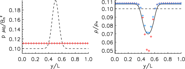 Figure 3: Vertical cuts for the plasma pressure (left) and plasma density ( right), for the same experiment as Figs. 1 and 2. Initial perturbed state (dashed) is compared with the final equilibrium, as found by the full MHD numerical simulations (solid) and predicted by the linear analysis (red crosses). For the density predictions, the blue crosses represent predictions from the adiabatic condition given by Eq. (38). |