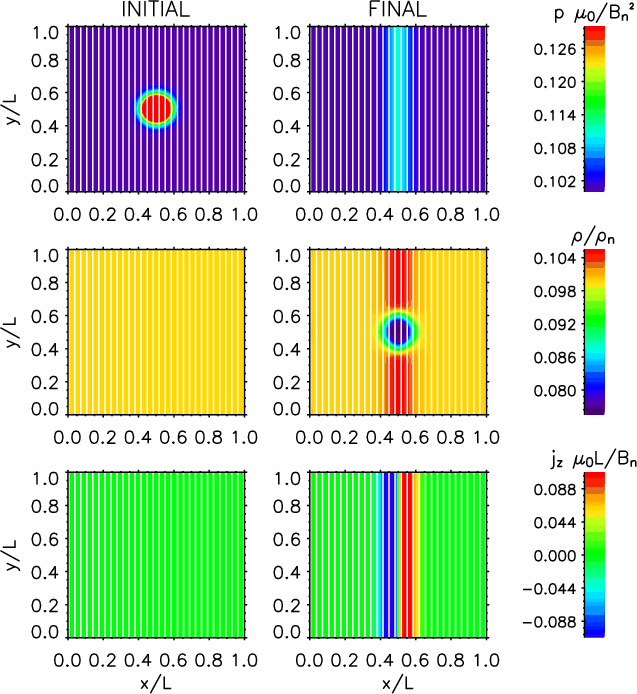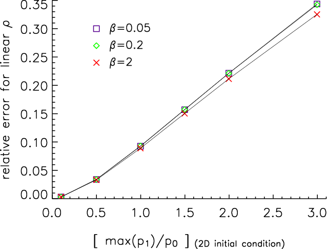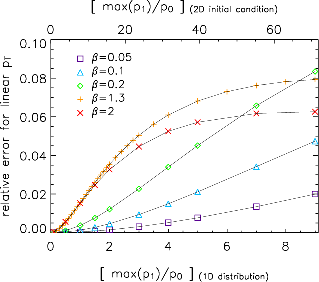 Figure 5 shows the relative error of the linear aproximation in both 1D and 2D for the total pressure, as a function of the amplitude of the initial perturbation, for five different values of the plasma beta (