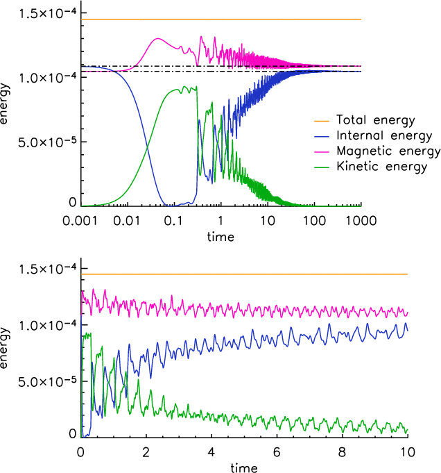 then the magnetic field will dominate over the plasma contributions, and much larger values for the relative initial perturbation will be needed for strictly leaving the linear regime. These two behaviors can be seen in Fig. 5,