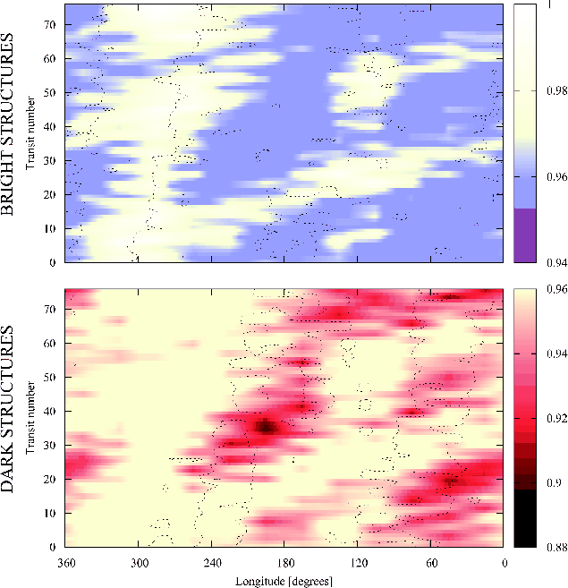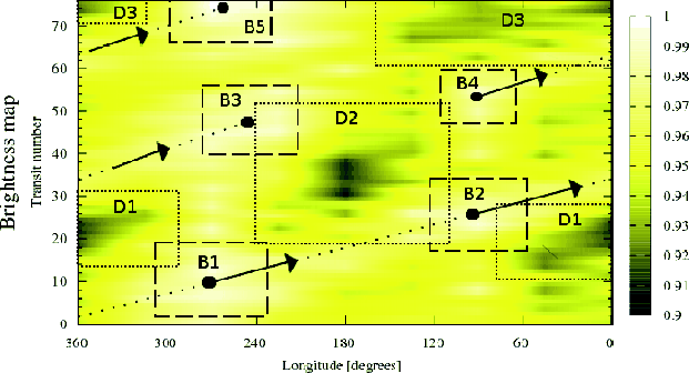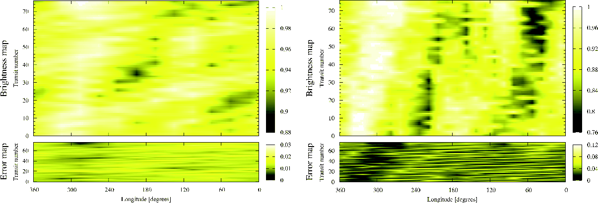 From the transits the brightness distribution on the eclipsed surface section is recovered,