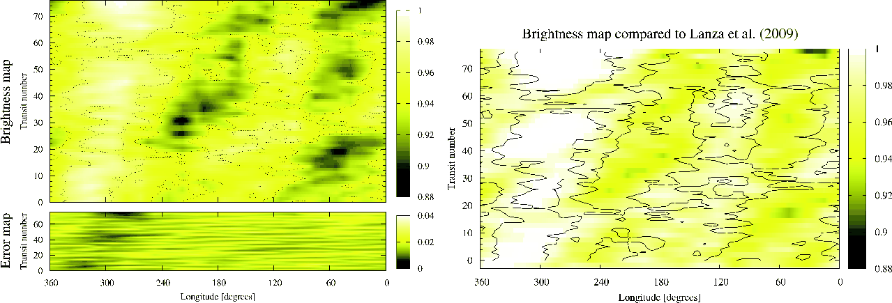 In a more comprehensive approach, Huber et al. (2009) reconstructed an interval of the CoRoT-2 lightcurve over two stellar rotations including the transits.