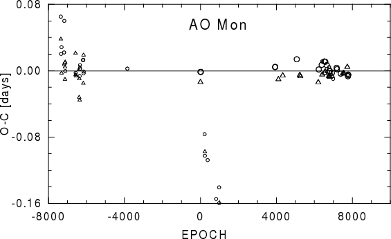 Figure 1: Complete O-C graph for AO Mon. The individual primary and secondary minima are denoted by circles and triangles, respectively. Larger symbols correspond to the photoelectric or CCD measurements, which were used in our calculations. Visual timings between epochs 0 and 1000 with large negative deviations were omitted. |