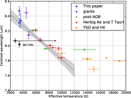 Our data are consistent with the strong correlation found between the centroid wavelength of the 7.9 m