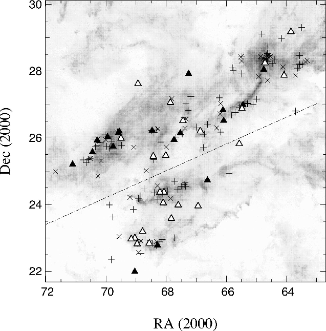 Figure 6: Taurus TTS and BDs superimposed on CO molecular gas. The dashed line delineates the separation chosen between the northern and southern filaments (see text). Symbols are identical to those in Fig. 1. |