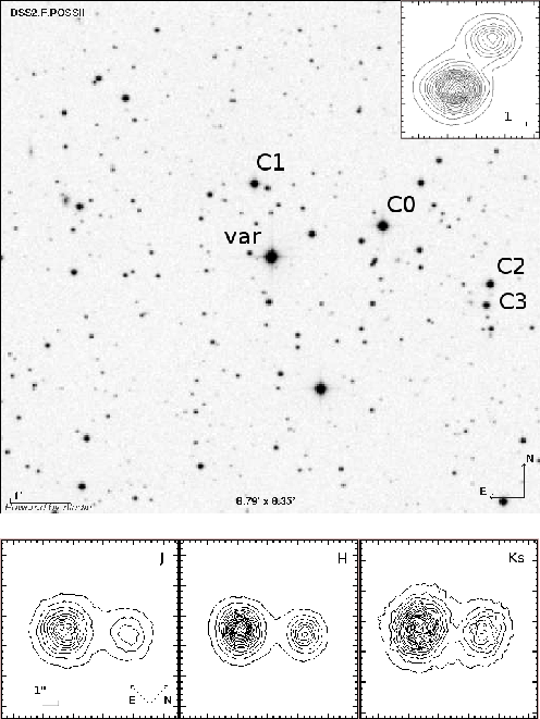 Note that the comparison star marked with C2 (Fig. 1) was found to have a close companion as well about 2.8 arcsec to the north and fainter by about 2.5 mag, which was measured together with C2 in most cases with the aperture photometry. From the PSF photometry (i.e., without its companion) C2 is found to be slightly redder (see Table 1), its approximate spectral type is early K and that of the companion is of mid-F, provided they are Main Sequence stars.