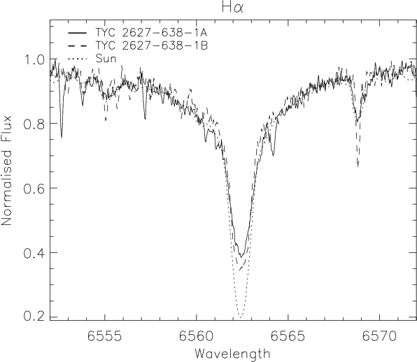 This companion is fairly close to the limit of the Tycho-2 catalogue (Høg et al. 2000). The source density in the Tycho-2 catalogue in this region of the sky can therefore be used to calculate the probability that the companion is a random star which is not gravitationally bound to TYC 2627-638-1. A Tycho-2 source-density of 92.75 objects per square degree is found, from which we calculate the probability of the pair being a random alignment to less than 0.01%. It is therefore clear beyond any reasonable doubt that these two stars are physically associated. This conclusion is substantially supported by the spectroscopic observations presented later in Sect. 3.3. For the remainder of the paper TYC 2627-638-1 is therefore referred to as TYC 2627-638-1A, while the fainter companion is referred to as TYC 2627-638-1B.