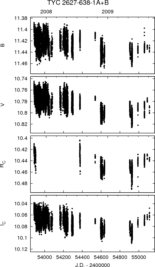 On 11 nights (three in 2007, one in 2008 and seven in 2009) we had excellent seeing conditions, and from those observations made with the 1-m telescope the brightness of TYC 2627-638-1A and TYC 2627-638-1B was derived in four colours separately with PSF photometry. Average magnitudes, standard deviations and fluxes for the two stars are given in Table 2. Both stars are unresolved in the CCD frames in most nights with the 1-m telescope and throughout all observations with the 60-cm telescope.