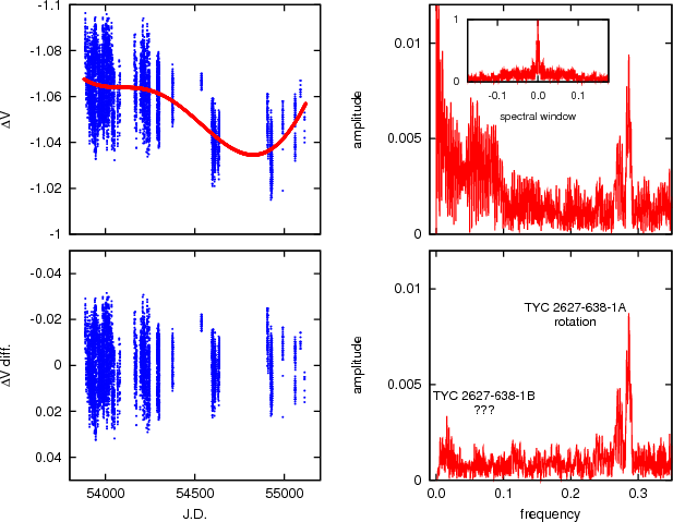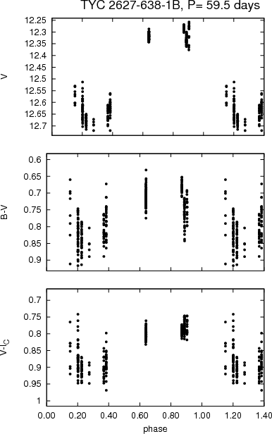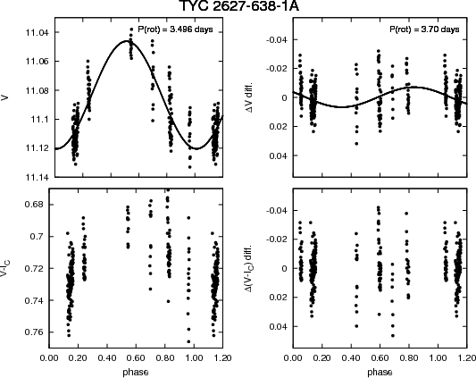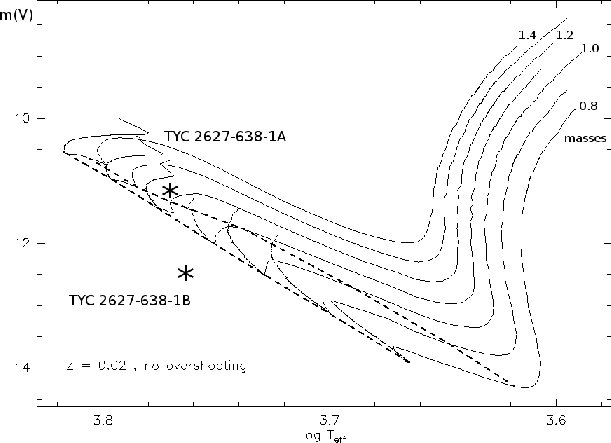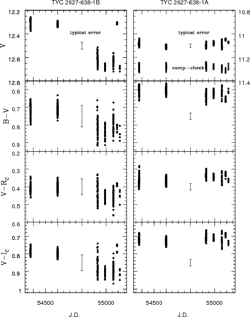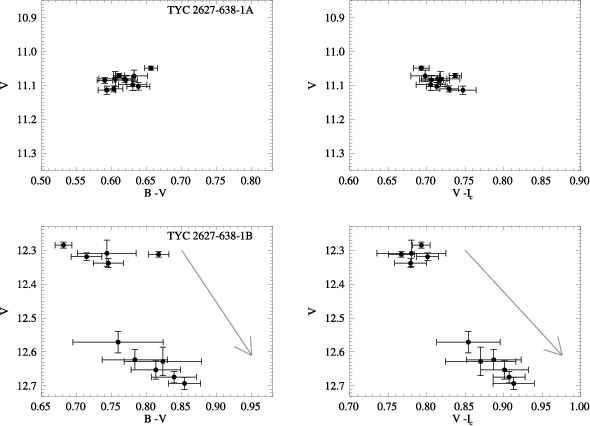 The 2MASS observation (Skrutskie et al. 2006) JHKs magnitudes (9.678, 9.442, 9.322, respectively) contains the light from both components, because according to the catalogue the nearest object is 6.7 arcsec away, whereas the two stars are only 1.84 arcsec from each other. Since the north-west companion TYC 2627-638-1B is redder than the brighter TYC 2627-638-1A (see Fig. 6), the 2MASS JHKs magnitudes contain more and more light from the companion.