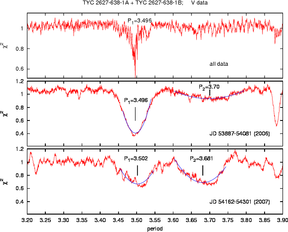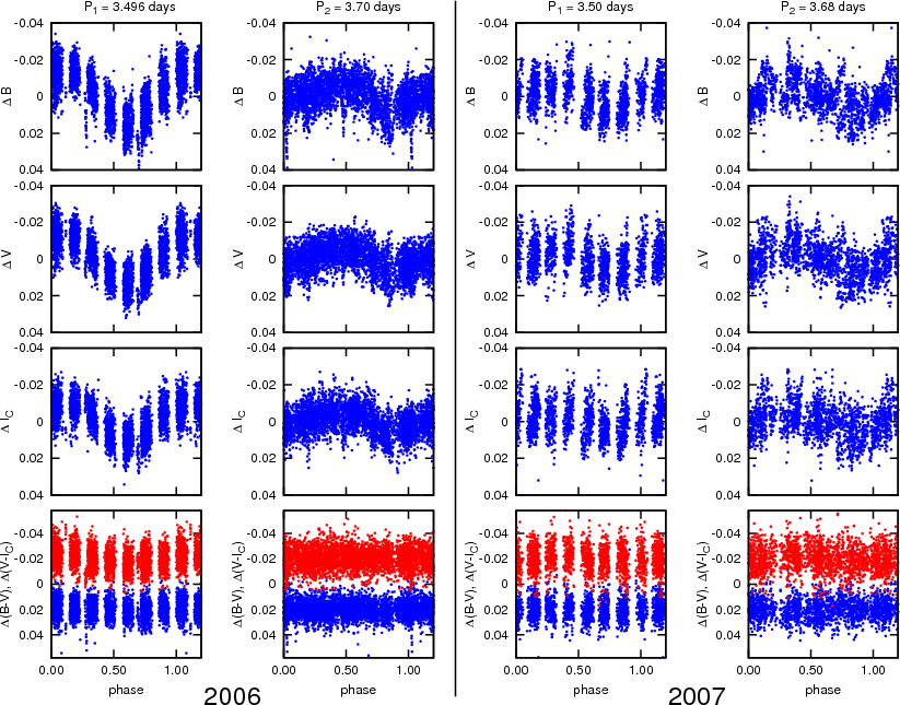periods, near 3.5 and 3.7 days, are found in the brightness