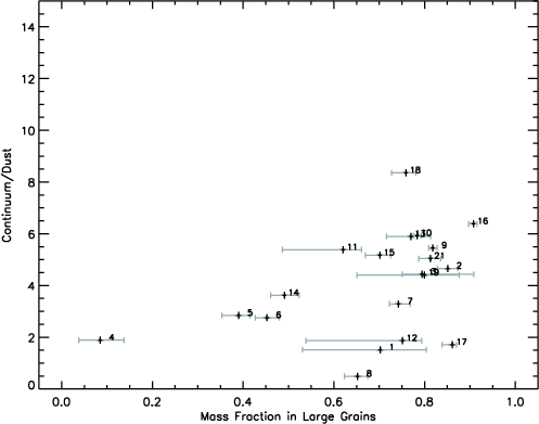 Erratum for Fig. 9 in Gielen et al. (2008): the continuum-to-dust ratio of the observed spectra plotted against the mass fraction on large grains (4.0 |