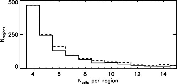 Figure 4: Histogram displaying the distribution of the number of cells per extended red region for the high-resolution (solid) and low-resolution (dashed) catalog. |