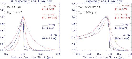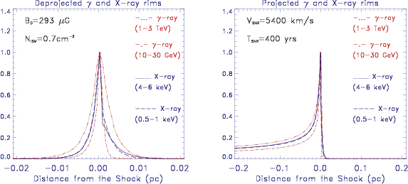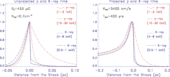 Chandra high-angular resolution X-ray observations of young supernova remnants (SNR) such as Cassiopeia A, Kepler or Tycho, have detected very thin X-ray filaments, which are probably associated with the supernova (SN) forward shock expanding into the interstellar medium (ISM) (Uchiyama et al. 2003; Hwang et al. 2002; Cassam-Chenaï et al. 2004; Rho et al. 2002; Bamba et al. 2005b; Cassam-Chenaï et al. 2007; Gotthelf et al. 2001; Bamba et al. 2005a). The physical properties of these filaments were reviewed by Vink & Laming (2003), Vink (2004), Weisskopf & Hughes (2006), Ballet (2006), Parizot et al. (2006), Bamba et al. (2006), and Berezhko (2008). These filaments are believed to be produced by synchrotron radiation emitted by TeV electrons. Rim-like filaments are usually of a few arcsecond in angular size as reported in Parizot et al. (2006). Their true width, however has to be inferred from deprojection calculationsby taking into account the curvature of the remnant (Berezhko et al. 2003a; Ballet 2006). This size should depend on the magnetic field strength, local fluid properties (the shock velocity and compression ratio), and the relativistic electron diffusion regime.