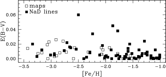 Figure 1: Adopted E(B-V) values vs. [Fe/H]. Filled squares are values based on NaD lines and open squares on reddening maps. |