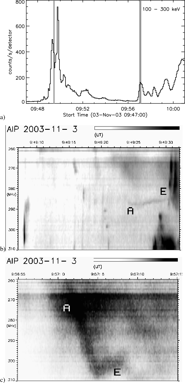 respectively) in dynamic radio spectral diagrams and simultaneously