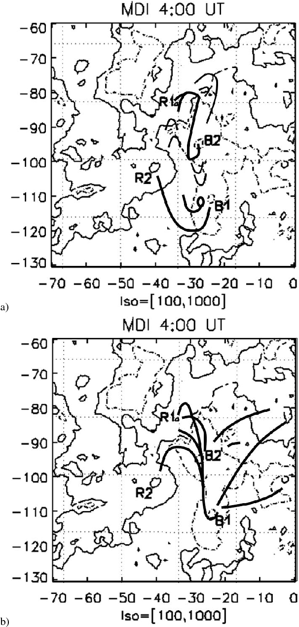 Figure 8: The simplified magnetic preflare (!) situation for the ROI. a) Top view. b) Side view from the West. Shaded: the region with the flare current sheet (CS) with the length L and the thickness 2l acting during the impulsive phase. The connection B1-R1 formed by re-connection is dashed and inserted in the side view, only, for simplicity. |