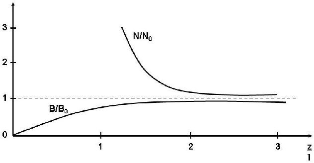Figure 10: Scheme of density N and magnetic field B vs. the surrounding reference values N0 and B0 drawn over an axis z perpendicular to the length axis of a CS of a thickness 2l, after Zhelesnyakov & Zlotnik (1980). z = 0 is the center of the CS. |