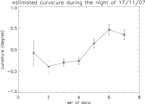 Figure 9: Evolution of the estimated phase curvature for the calibrator HD 9362 as a function of the considered spectrum (or set of data). The number on the x-axis, giving the set of data, corresponds to the chronological order of measurements during the night. |
