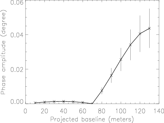 As a step towards potential detection, a more favourable source providing a stronger signal could become available since new targets have been discovered by radial velocimetry. In this case, a better resolved and, at the same time a warmer planet would be appropriate. Thanks to better resolution, we would have an almost complete sine modulation cycle all over the whole N band (see Fig. 1) and no longer a quasi-linear phase. It would thus imply a larger remaining phase amplitude due to the planet, after suppression of the piston.