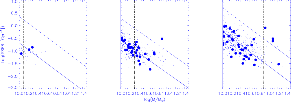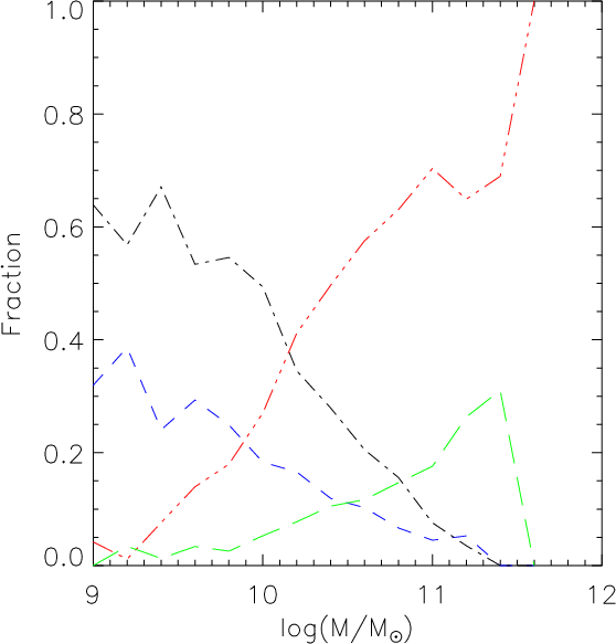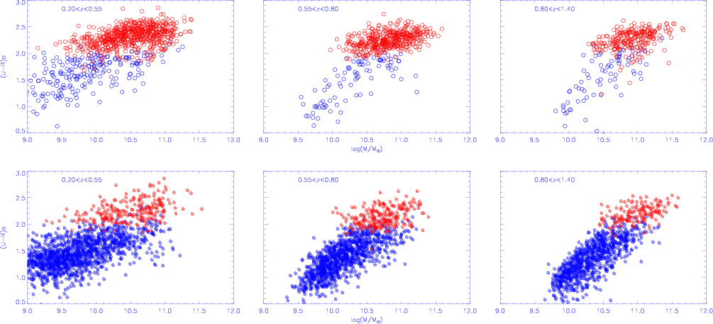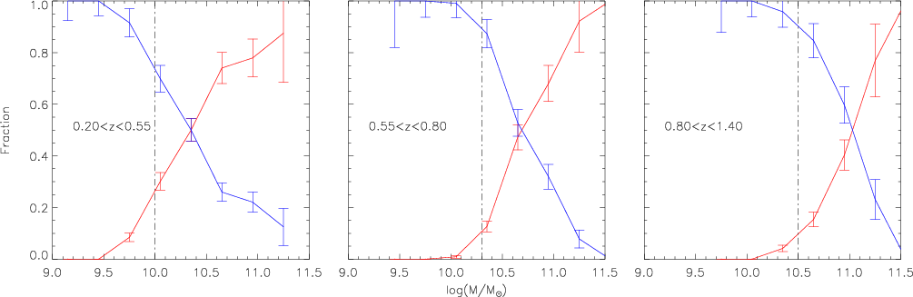 the early and late type populations (bimodality mass) indicating that