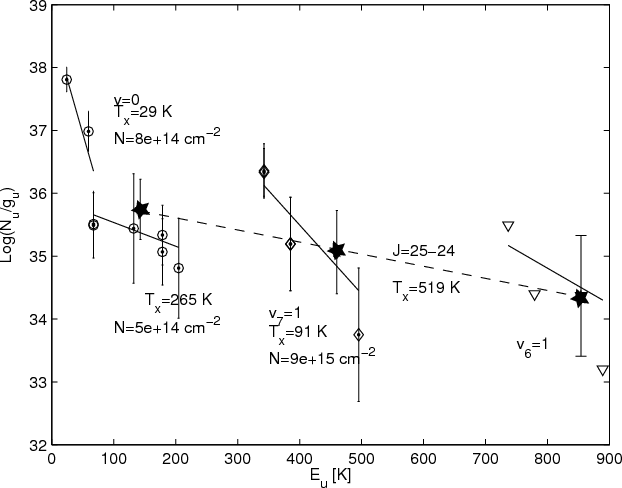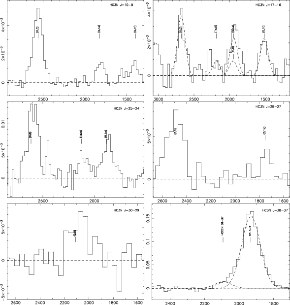 In surveys of external galaxies (see Sect. 4.5), bright HC3N J=10-9 line emission is found in a subset of IR luminous galaxies. The HC3N line emission is a useful tracer of warm and dense regions and is extremely sensitive to a strong IR-field because of its multiple, mid-IR bending modes. The molecule is often found to be abundant in Galactic hot cores (e.g., de Vicente et al. 2000) and can be easily destroyed by intense UV and particle radiation. Thus HC3N serves as a tracer of the gas (and dust) properties of galaxies with intense IR fields but where the dense gas is not too exposed to destructive radiation.