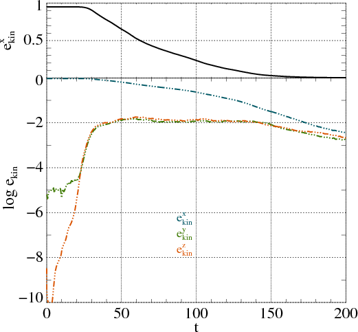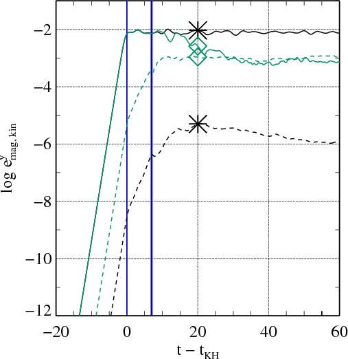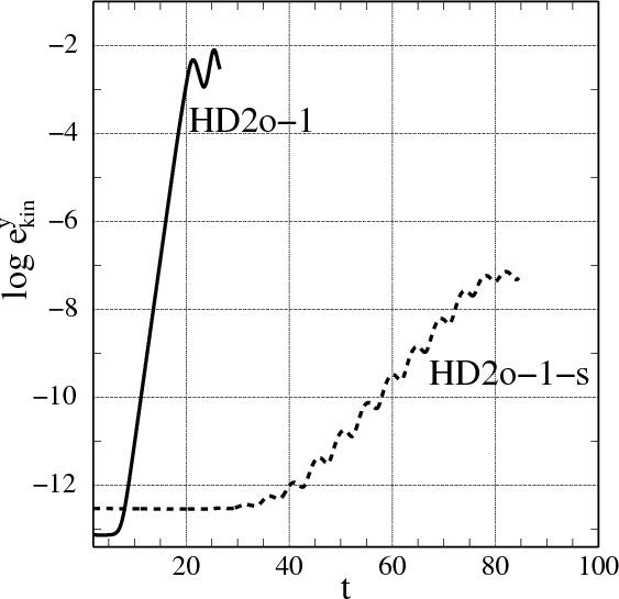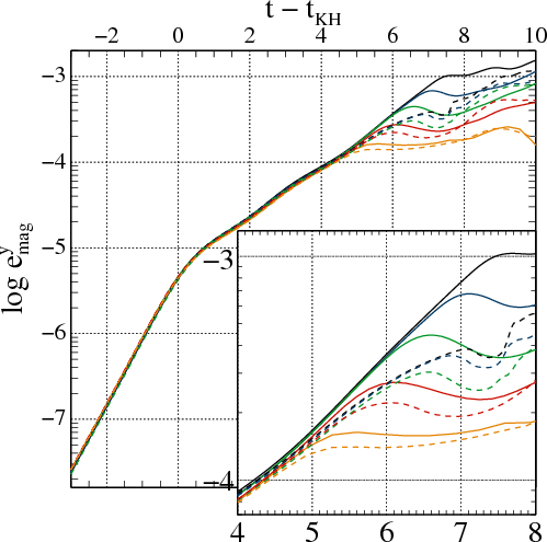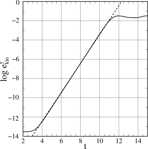 Linear growth phase of the KH instability in model grw-3. The solid black line shows the volume-averaged kinetic energy