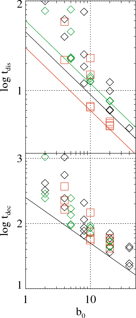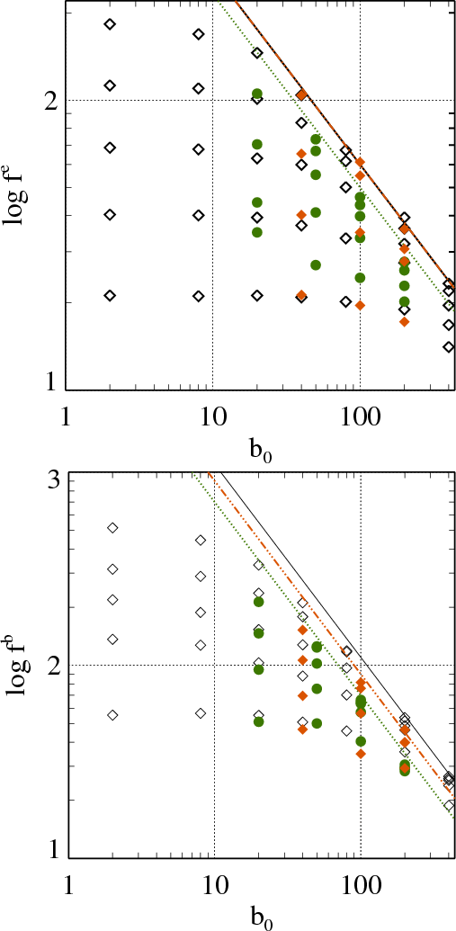 fe ( top panel) and the magnetic field strength, fb (bottom panel) as a function of the initial magnetic field, b0,