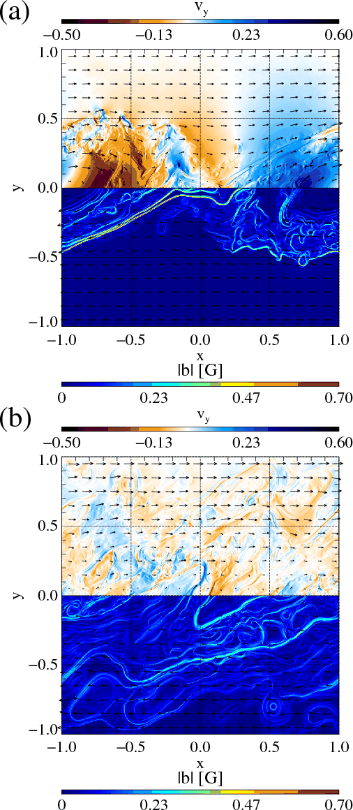 The exponential amplification of seed perturbations can lead to very strong magnetic fields as shown by Price & Rosswog (2006), and Rosswog (2007). These fields, in turn, can modify the dynamics of the instability described above, either already during its linear growth phase or, for weak fields, in the saturated state. Exerting stresses and performing work on the fluid, the magnetic field does lose part of its energy. Thus, the maximum attainable field strength is limited by the non-linear dynamics.