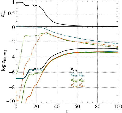 Volume averaged transverse kinetic (solid) and magnetic (dashed) energy densities