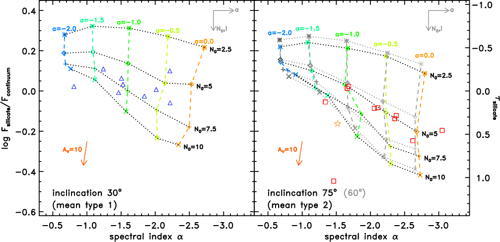 is almost exclusively determined by the radial dust distribution power-law index a, while the silicate feature depth mostly depends on N0