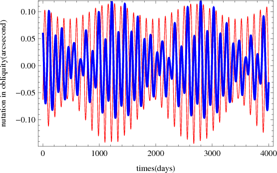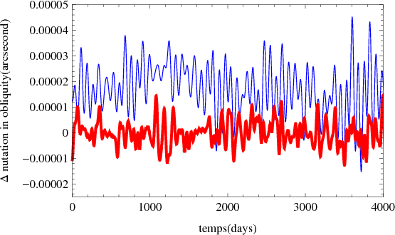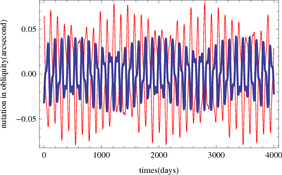 Figure 10: Difference between the obliquity nutation of the AMA and the numerical integration for 4000 d time span, from J2000.0. The curve at bottom represents the residual after substracting the sinusoidal terms of Table 13. |