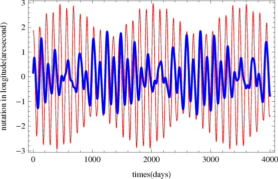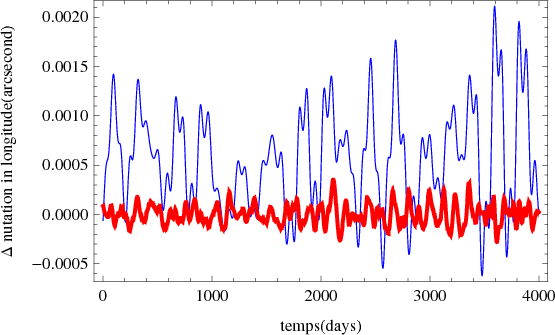 Figure 11: Difference between the nutation in longitude of the AMA and the numerical integration for 4000 d time span, from J2000.0. The curve at bottom represents the residual after substracting the sinusoidal terms of the Table 14. |