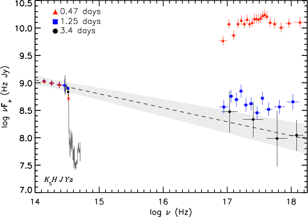 (SED) of the afterglow at three different epochs, 0.47, 1.25, and