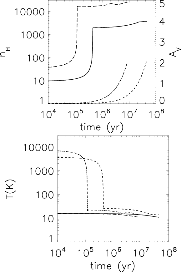Prior investigations have considered some aspects of the problem we discuss here. Early dynamic models of dense and diffuse clouds were reviewed by Williams (1988). Cyclic models involving shocks were studied by Nejad & Williams (1992). Our approach is similar to the constant-pressure collapse model of Pineau des Forêts et al. (1991), although that paper did not include grain surface chemistry. Such chemistry was included by Ruffle & Herbst (2001) in a pseudo-time-dependent model of the formation of mantle ices using an earlier version of our gas-grain network. These authors were mainly interested in explaining the formation of CO2 ice, which had been under-produced in their previous models. A pseudo-time-dependent approach with surface chemistry was also used to study the water ice distribution at various conditions throughout the Taurus dark cloud (Nguyen et al. 2002).