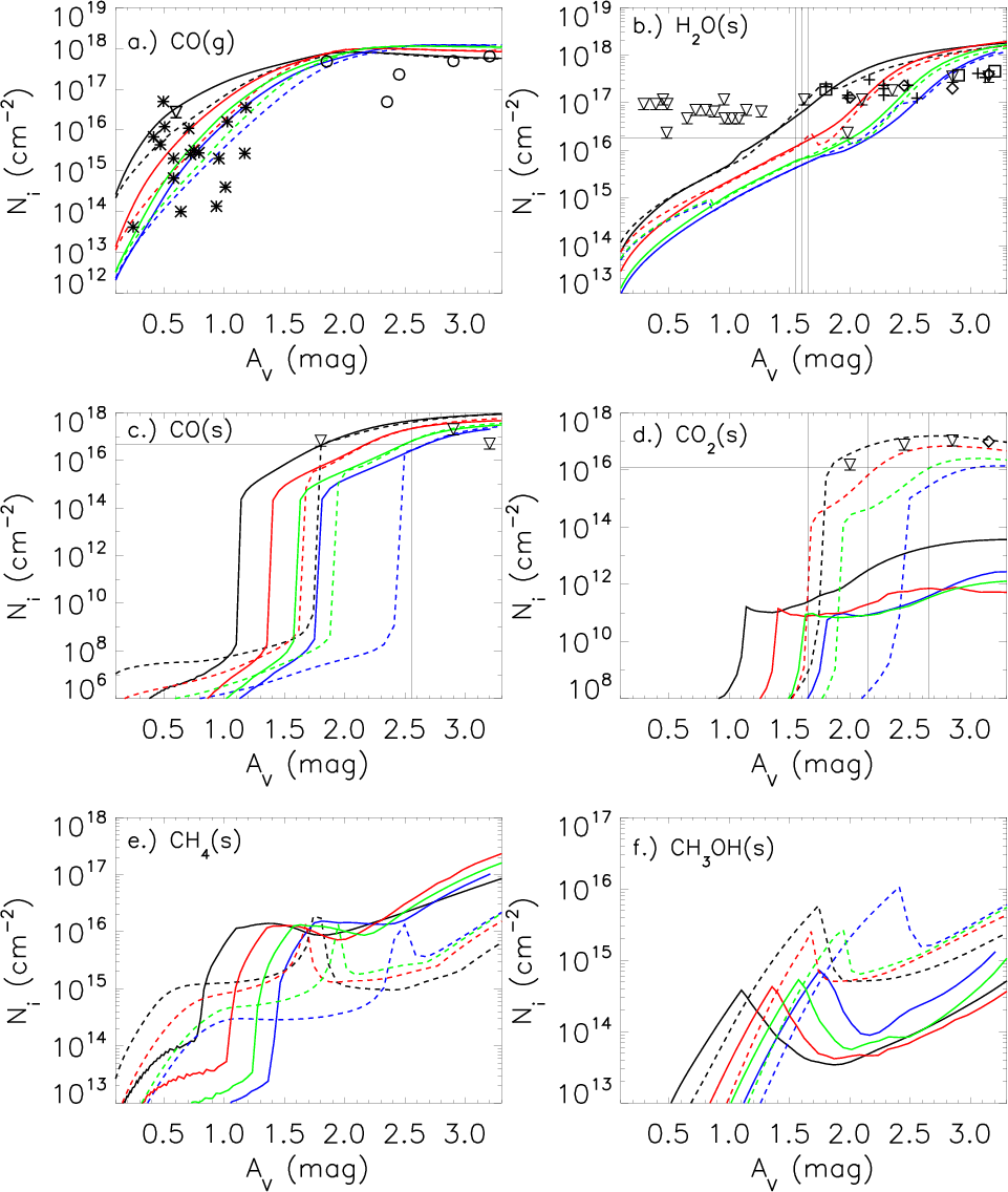 - The growth of CO(s) slows down the rate of synthesis of CH4(s) because there is less of its precursor, neutral C, available. By an extinction of 3.0, the methane column densities for individual models tend to lie below those of CO(s), especially for the B parameter set, in which the dust temperature is higher.