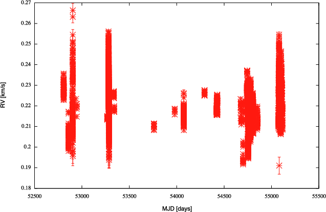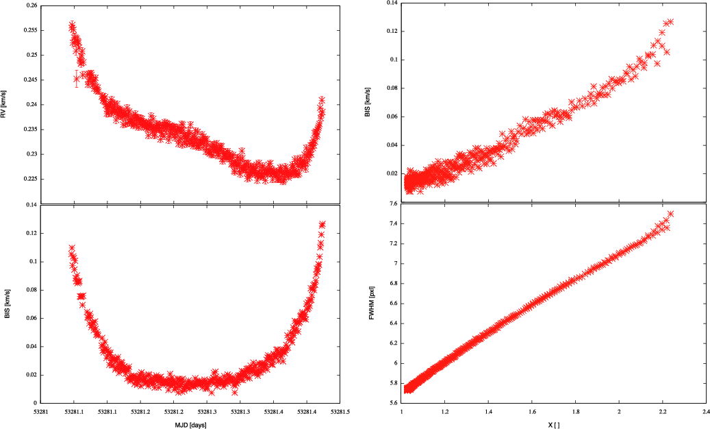 The low chi-squared, within the range 2.5-4.01, attests to the validity of the empirical description of the RV variation. The residuals around the fit are about twice the photon noise, showing that this correction is effective down to roughly 2 m/s. As an example, the fit to the data set corresponding to the first night of the Tau Ceti campaign is presented in Fig. 3.