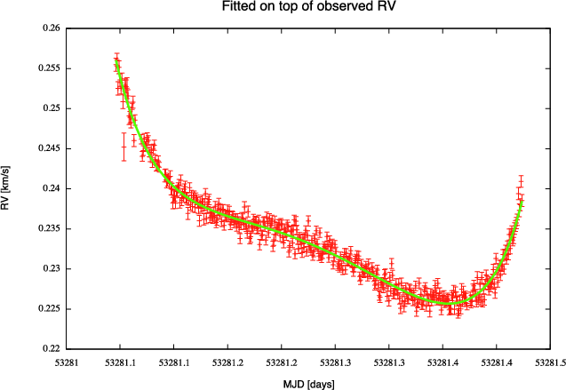 Figure 3: The fit of the atmospheric lines RV variation for the first night of the asteroseismology run of Tau Ceti. The fitted model is described by Eq. (2) and the parameters are presented in Table A.1. |