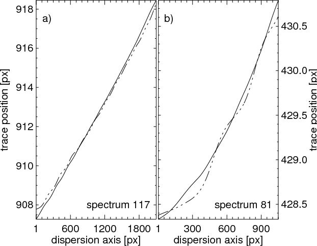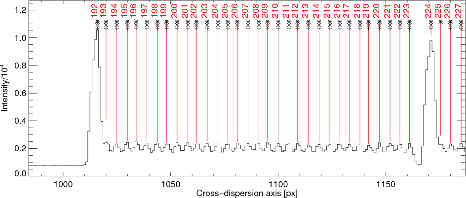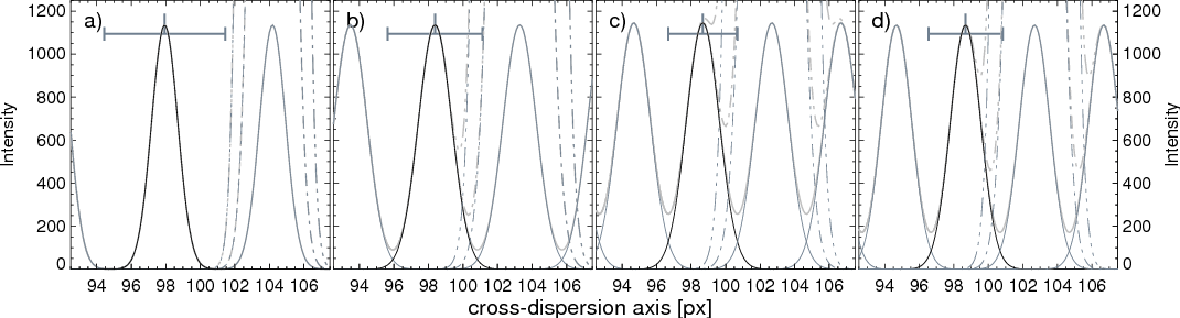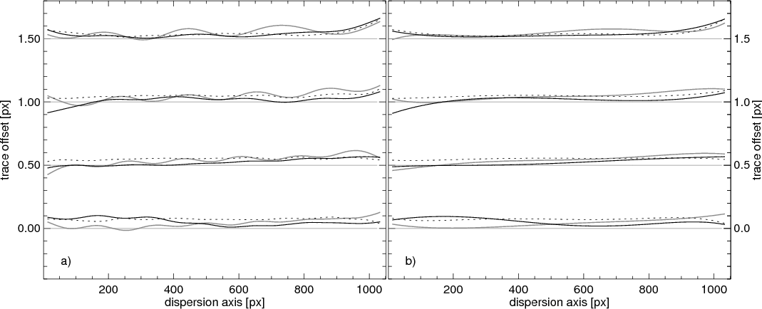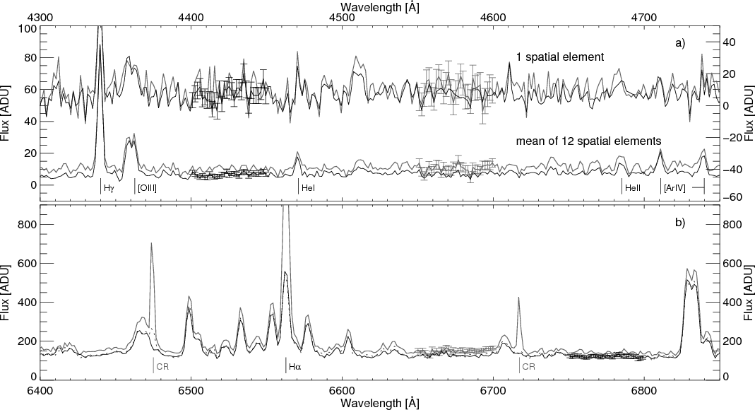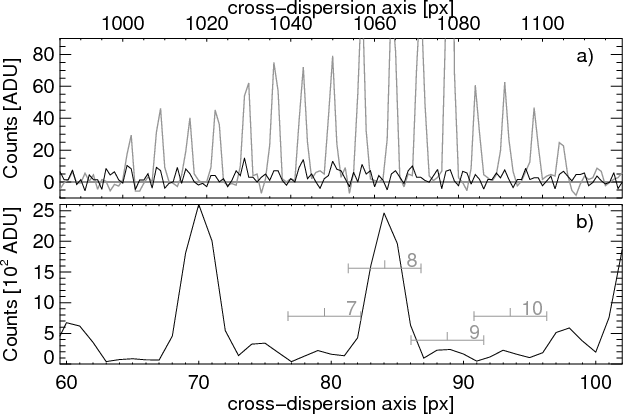 Parts of the bias-subtracted raw data used to extract the spectra of Fig. 14. The counts are plotted for one wavelength across the cross-dispersion axis for data of LARR, panel a), and PPAK, panel b). In panel a) the group of profiles drawn in gray is shown for the center wavelength of H |