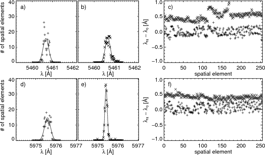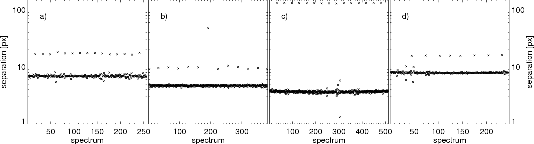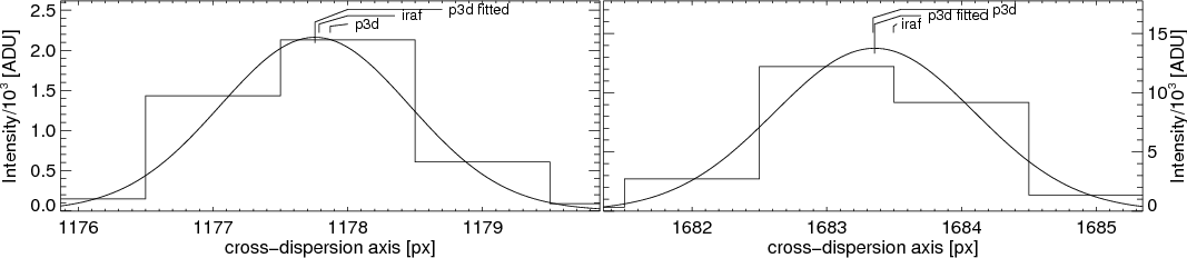 Figure 8: Profile center positions across the cross-dispersion axis for IRAF, P3D, and fitted profiles of P3D for two wavelength bins of two different spectra on the detector. The raw data is drawn as a histogram, and the Gaussian fitted profile is shown as a continuous curve. For more details see Sect. 4.1. |