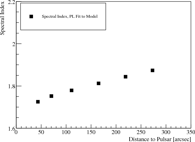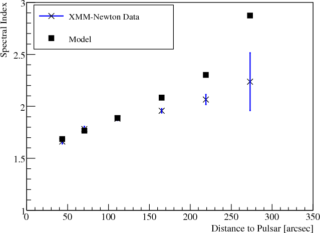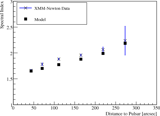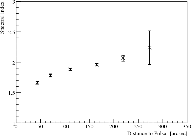 Figure 3: Spectral index of the power-law fit to the XMM-Newton data of the different regions versus the mean distance of the extraction regions to the pulsar. A steepening of the spectrum is observed with increasing distance. |