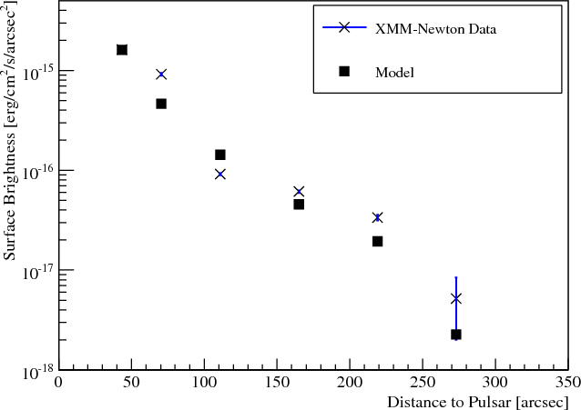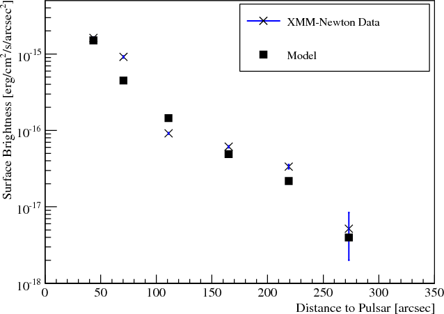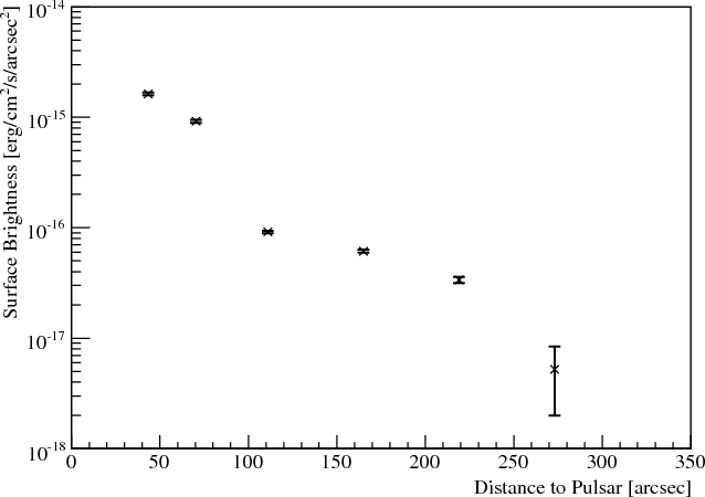 Figure 4: Surface brightness of the X-ray emission of the PWN in the 0.5-9.0 keV band as a function of the distance to the pulsar. |