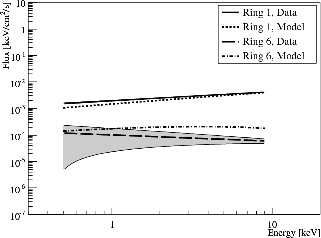 The parameters of the spectral power-law fit - absorption column density, photon index and normalization - were linked for the fitting of the different observations. The absorption column density does not vary significantly between the different regions and was fixed to the value of the first ring. The fit range was from 0.5-9.0 keV for rings 1 to 5, while for ring 6 we chose a narrower fit range of 3.0-9.0 keV, due to the insufficient statistics at low energies. As an example, Fig. 2 shows the fit of an absorbed power law to the observed emission of ring 1.