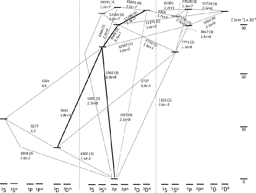 Grotrian diagram for the principal transitions of O I involving all levels up to 105 cm-1.