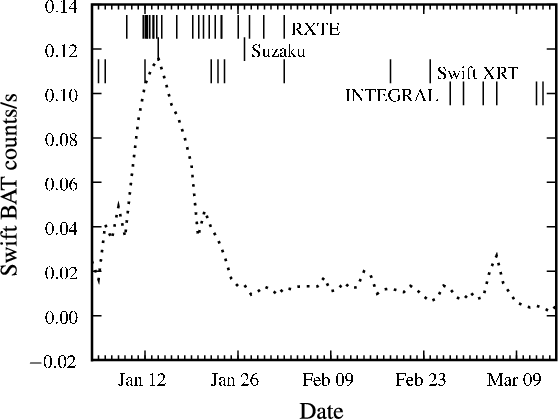 The outburst was observed by multiple X-ray missions. The source light-curve as observed by Swift/BAT with marked observation times by various satellites is presented in Fig. 1. The source flux peaked on 2009 January 14, (Swift/BAT countrate 0.12 counts/s corresponding to